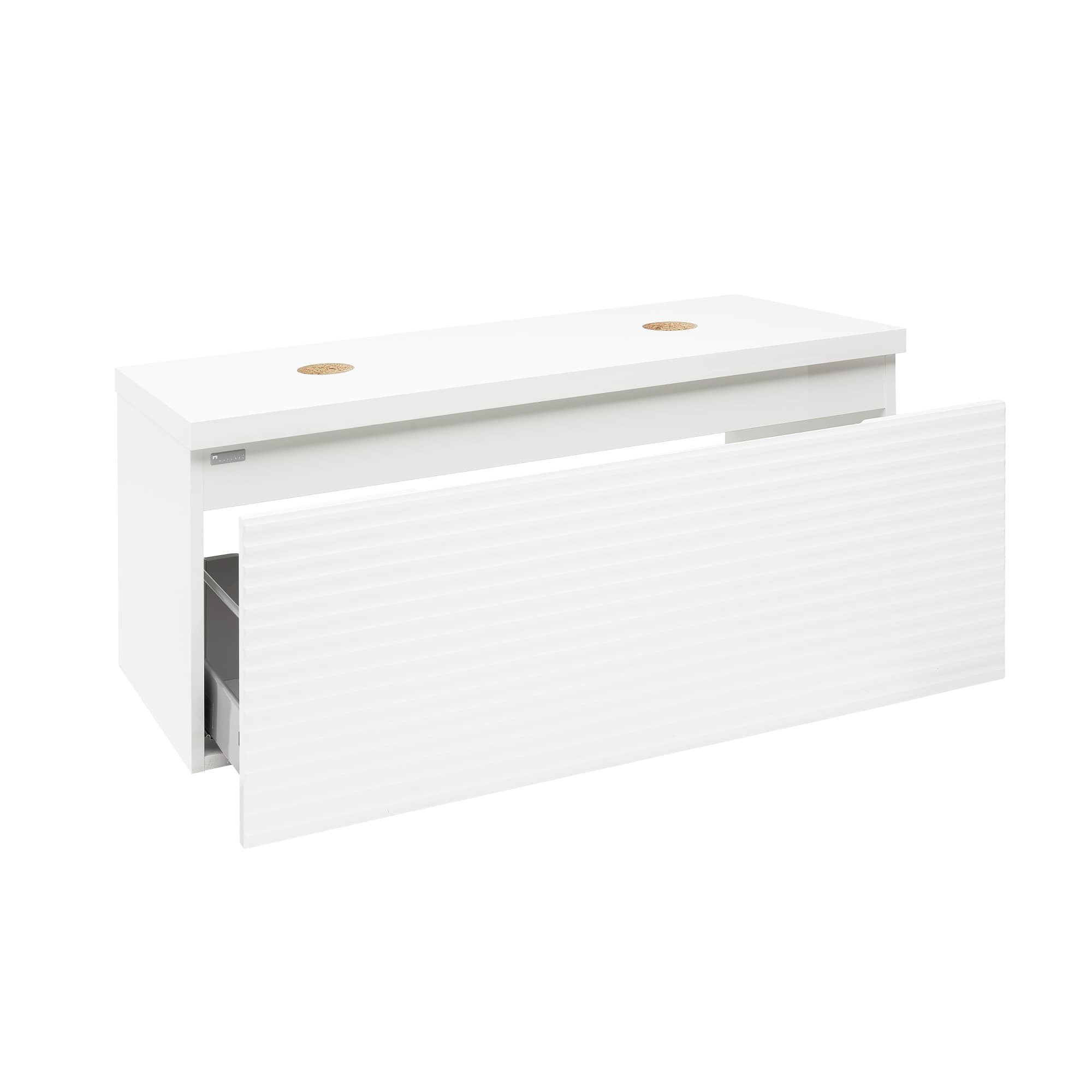 Avec ses 118 cm de largeur et son vaste tiroir, ce meuble constitue la solution idéale pour organiser facilement vos accessoires de salle de bain. Pré-découpé, il offre la possibilité d'installer 2 vasques sur son plan de recouvrement.