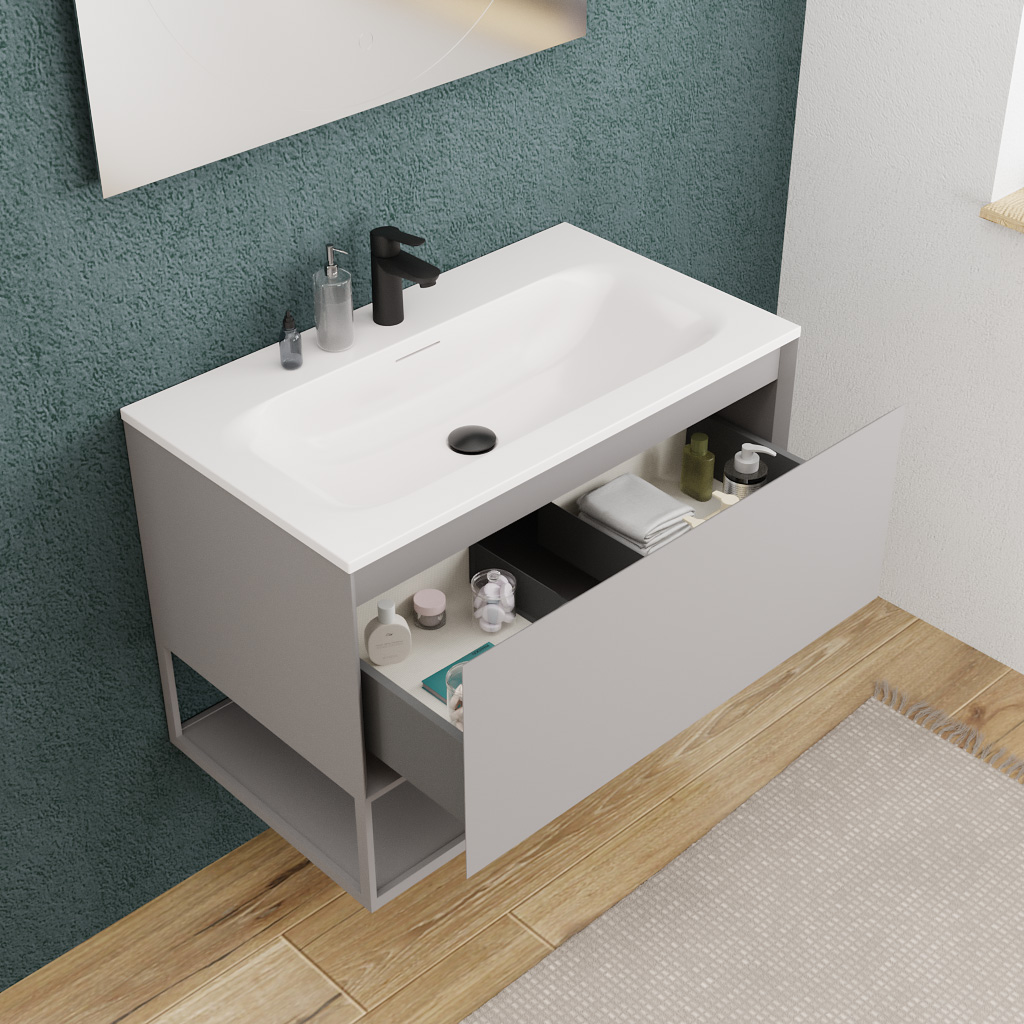 Ce meuble avec tiroir intégré, spécialement conçu pour s’installer sous une vasque, est idéal pour maximiser le rangement sans encombrer l’espace. Il est pensé pour accueillir siphon et plomberie grâce à une découpe intérieure spécifique.