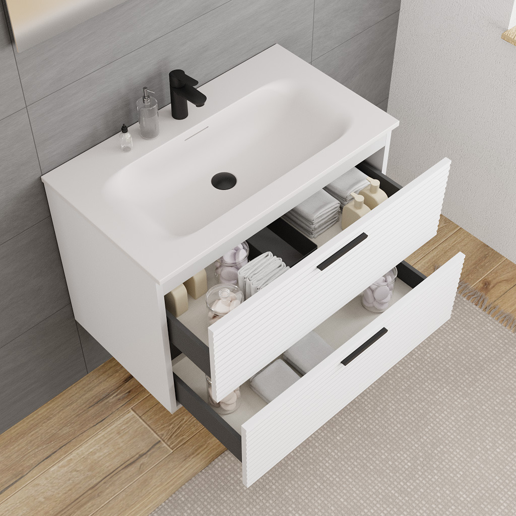 Alliez élégance et compacité avec le meuble de salle de bain Ceramia 80 cm blanc cassé, conçu pour les petits espaces sans compromis sur le style. Son design épuré et ses façades striées sans poignées lui confèrent un aspect moderne et minimaliste, parfait pour une ambiance douce et contemporaine.