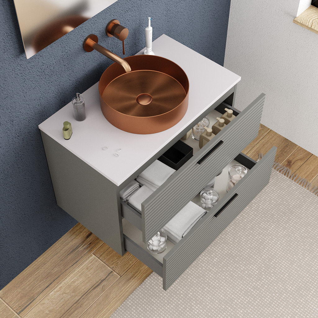 Le plan vasque est livré non percé, avec un préperçage discret pour laisser le choix entre robinetterie murale ou sur plan.