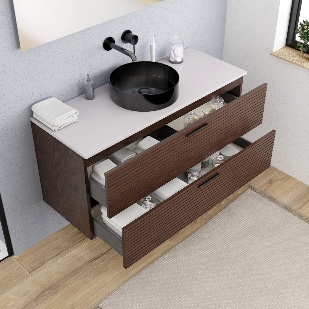 Le plan vasque, au design moderne et épuré, est livré non percé, avec un préperçage discret vous permettant de choisir librement un mitigeur mural ou à poser. Doté de 2 tiroirs spacieux à fermeture douce, ce meuble allie praticité, esthétisme. Un meuble complet, fonctionnel et élégant, idéal pour les projets de rénovation modernes.