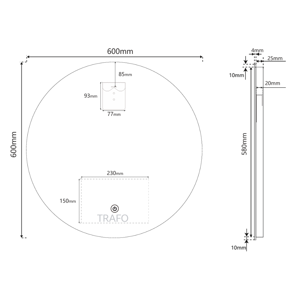 Naturel Miroir rond LED, diamètre 60cm, capteur tactile avec mémoire, anti-buée, résistance à l'eau IP44 (ZPRKU60LED)
