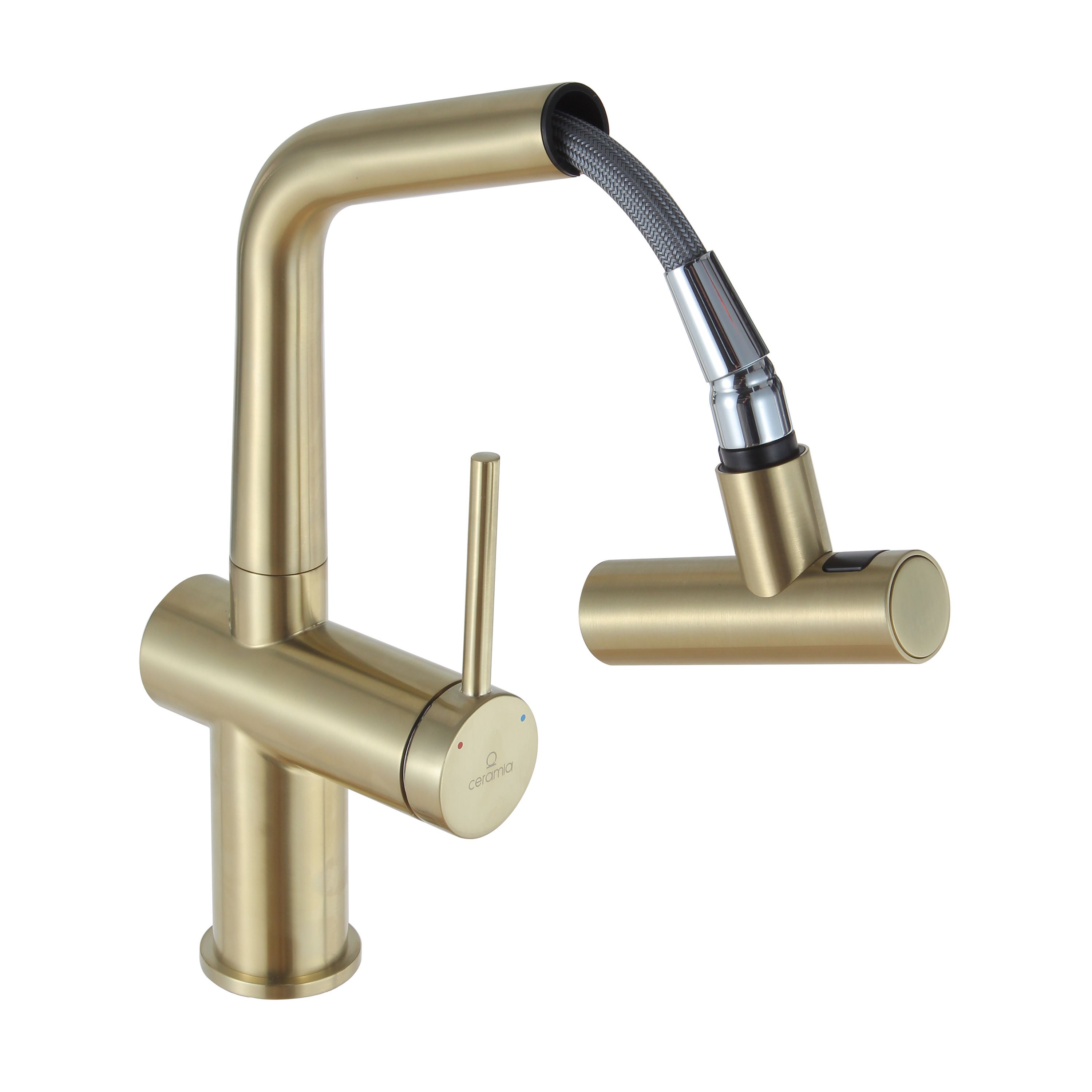 - Ceramia Timeless mitigeur d'évier à levier en acier inoxydable avec douchette extractible, monotrou, or brossé (TMLKF185BG)