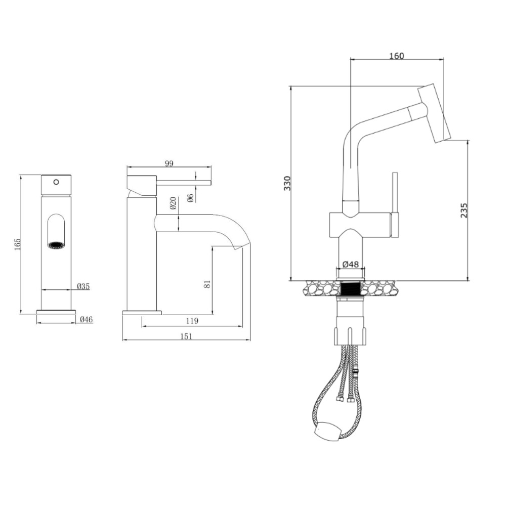 Caractéristiques du mitigeur lavabo sur pied 16,5 cm, à levier, sans vidage, Swiss Aqua Technologies Aurum + mitigeur cuisine à levier Ceramia Timeless acier inoxydable, douchette extractible, or brossé (SATTMLBA185BG) :