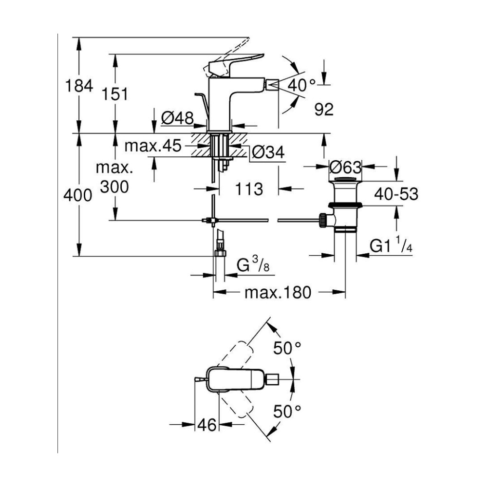Caractéristiques du mitigeur monocommande de bidet à levier avec vidage, Grohe Dice, chrome brillant (1018770000) :