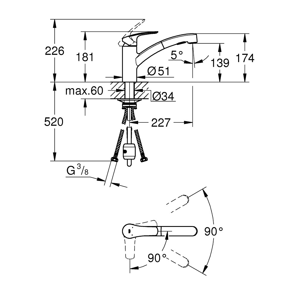 Caractéristiques du Mitigeur cuisine, monocommande avec douchette extractible 2 jets, Chrome, Grohe Eurosmart :