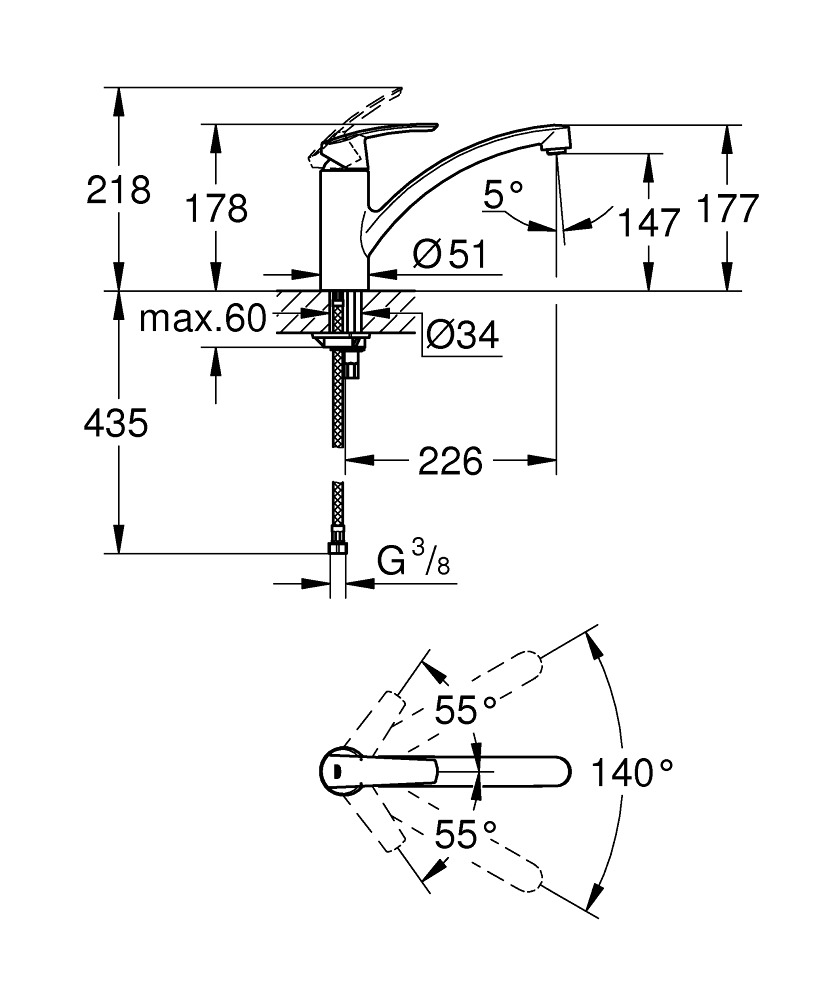 Caractéristiques Mitigeur monocommande évier, zone de rotation 140°, supersteel , Grohe Start (G-32441DC1) :