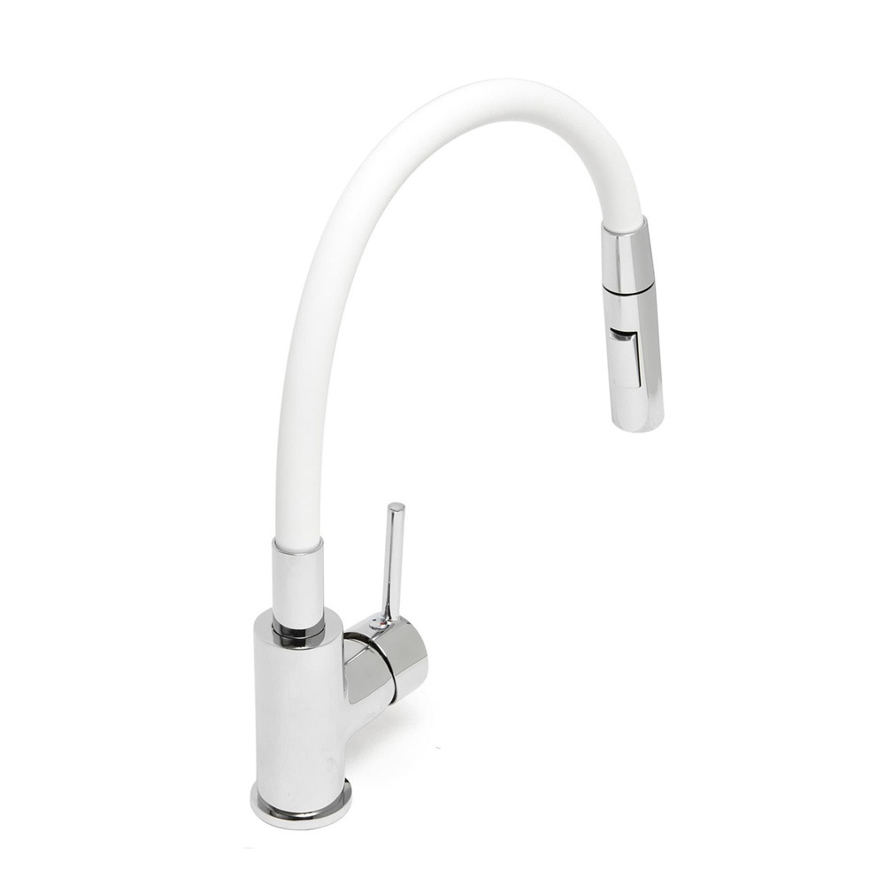 Caractéristiques du mitigeur cuisine à mémoire de forme, 2 types de jet mousseur ou douchette, courbe en silicone blanc (SIKOBSLPRO290B2F):