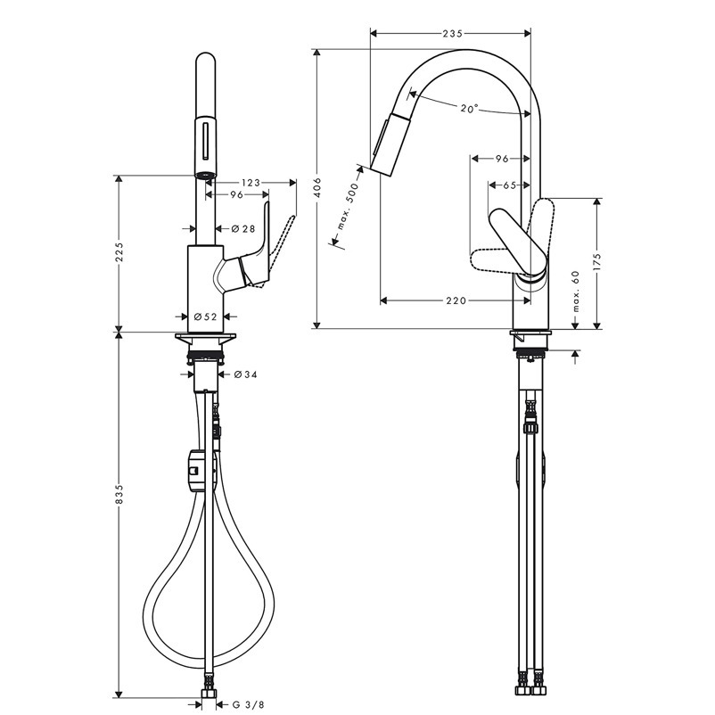 Caractéristiques du mitigeur de cuisine Hansgrohe 240 noir mat, avec douchette extractible (31815670) :
