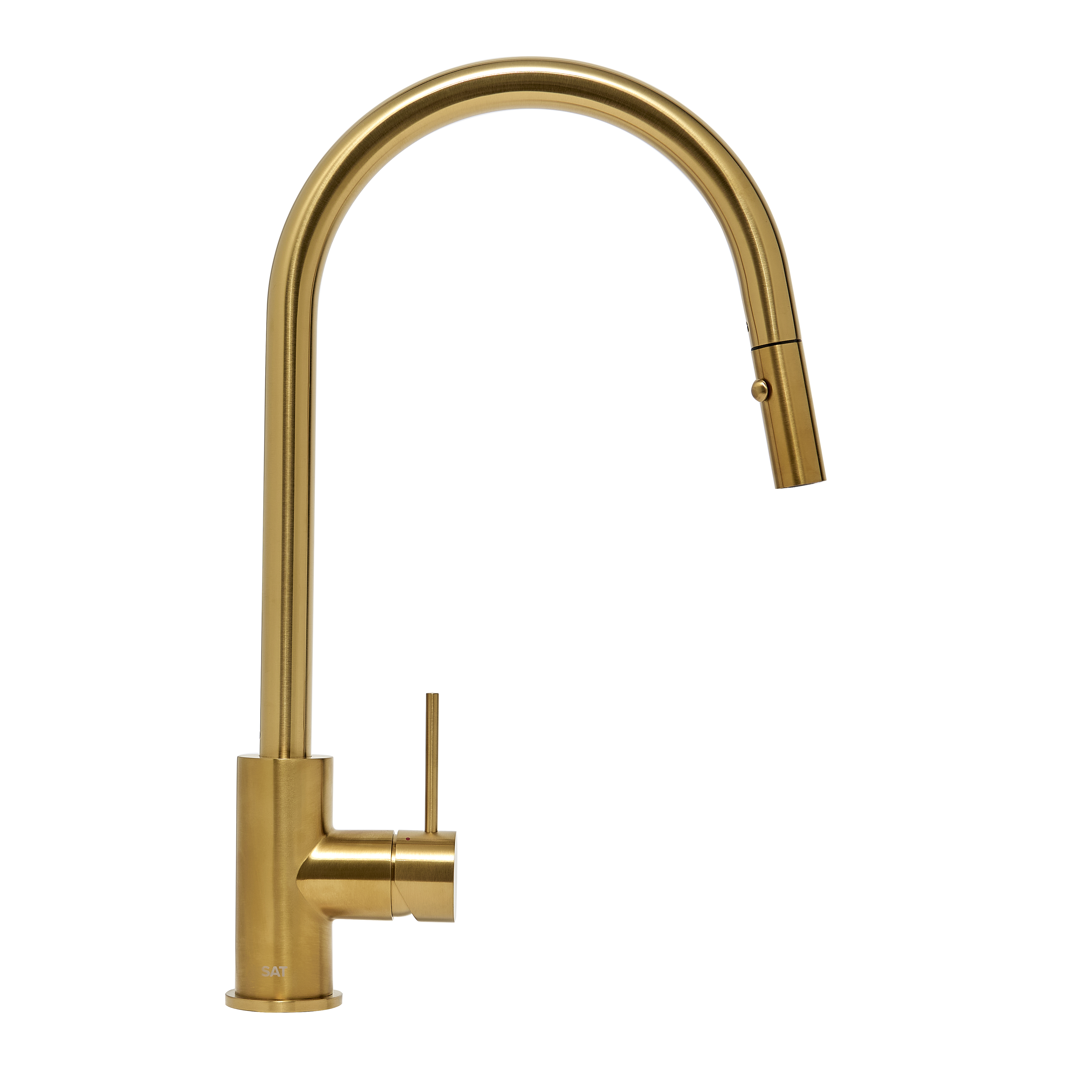 Caractéristiques du mitigeur évier à levier sur pied 44 cm avec douchette extractible 2 jets, Swiss Aqua Technologies (SAT) Aurum, or brossé (SATBAUR286BG) :