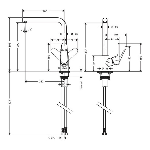 Caractéristiques du Mitigeur d'évier 280 avec bec en L, 1 jet, Inox brossé, Hansgrohe Focus M41 (31817800) :