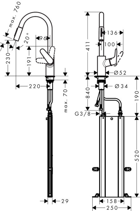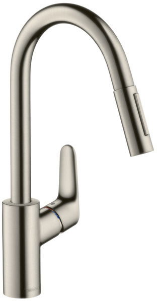 Caractéristiques du Mitigeur de cuisine avec douchette extractible 2 jets, sBox, Aspect acier inox, Hansgrohe Focus M41 240 (73880800) :
