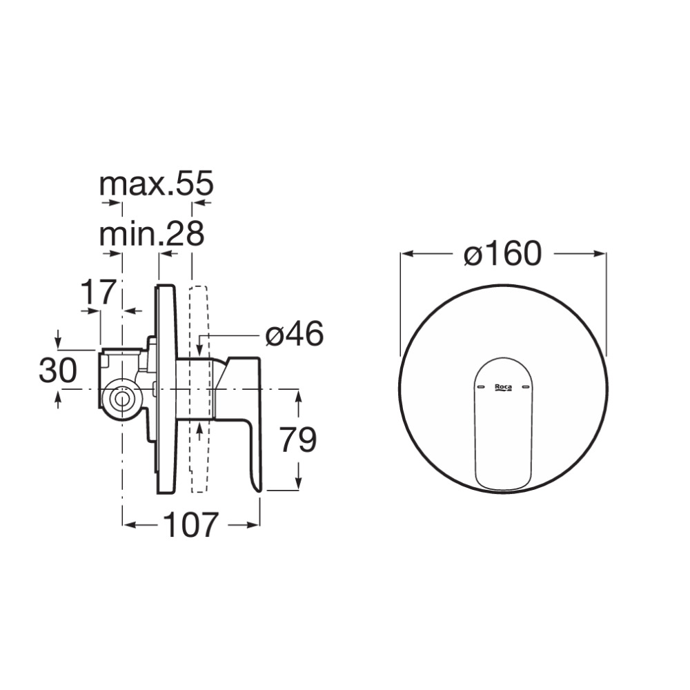 Caractéristiques du mitigeur de douche à encastrer à levier, sans ensemble de douche, Roca Cala, chrome (A5A226EC00) :
