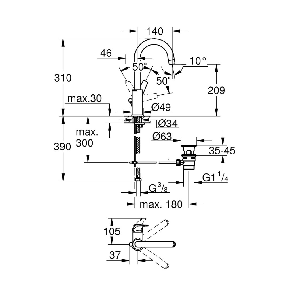 Caractéristiques du mitigeur monocommande de lavabo, taille L, Grohe Start Flow, chrome (23811000) :