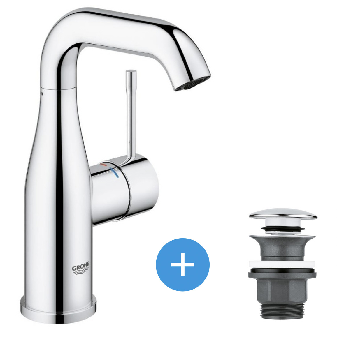 Le set est composé d'un mitigeur Grohe Essence monocommande 1/2" Lavabo Taille M (23463001) et d'une bonde clic clac pour lavabo avec trop-plein (40824000) :