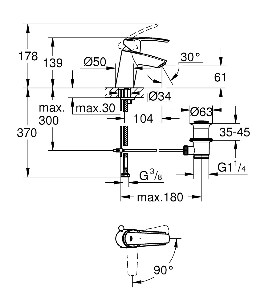 Caractéristiques du mitigeur monocommande lvabo taille S avec Limiteur de température, Chrome Grohe Start (31137001) :