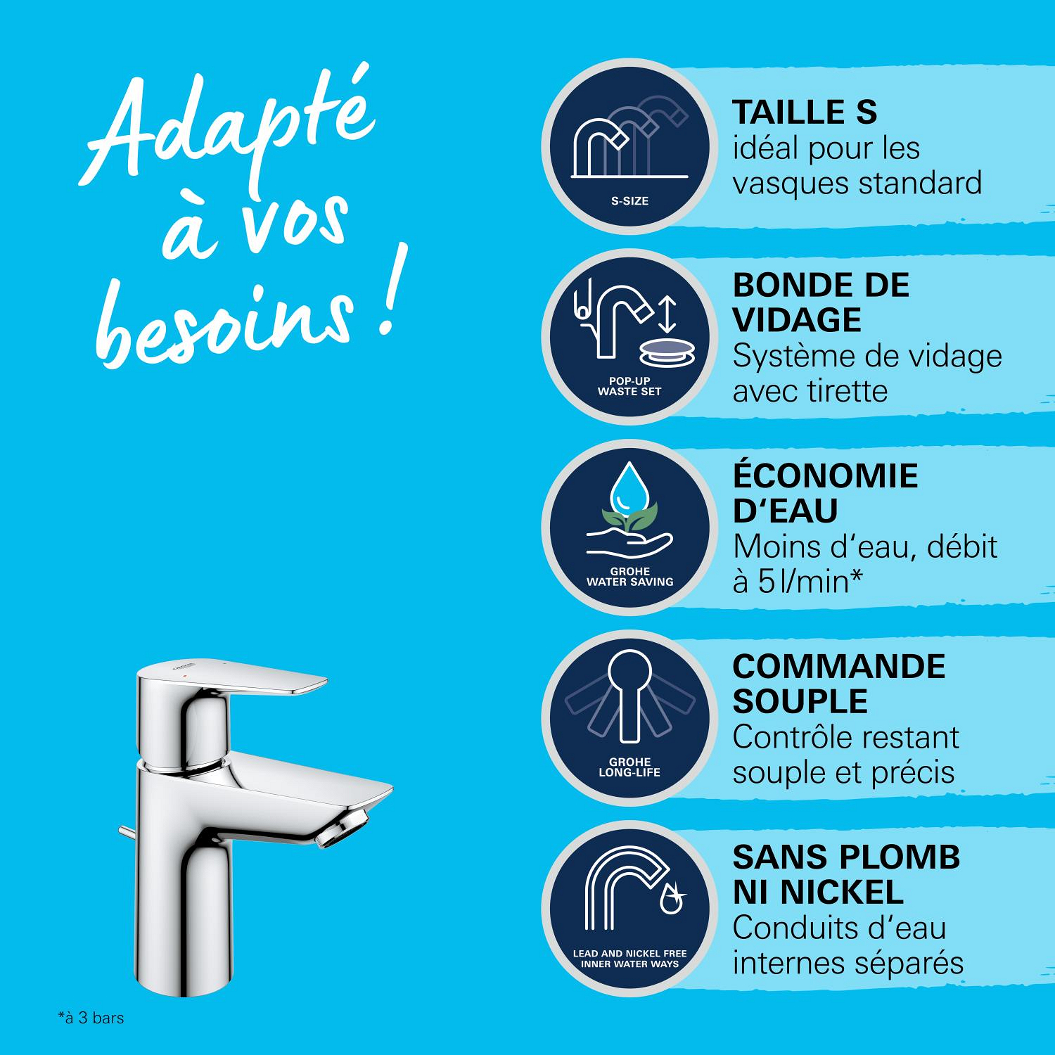 Grohe START EDGE Mitigeur lavabo avec vidage, Taille S, Chrome (24196001)