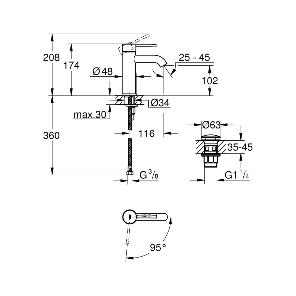 Caractéristiques du mitigeur monocommande lavabo taille S, Grohe Essence, chrome (G23797001) :