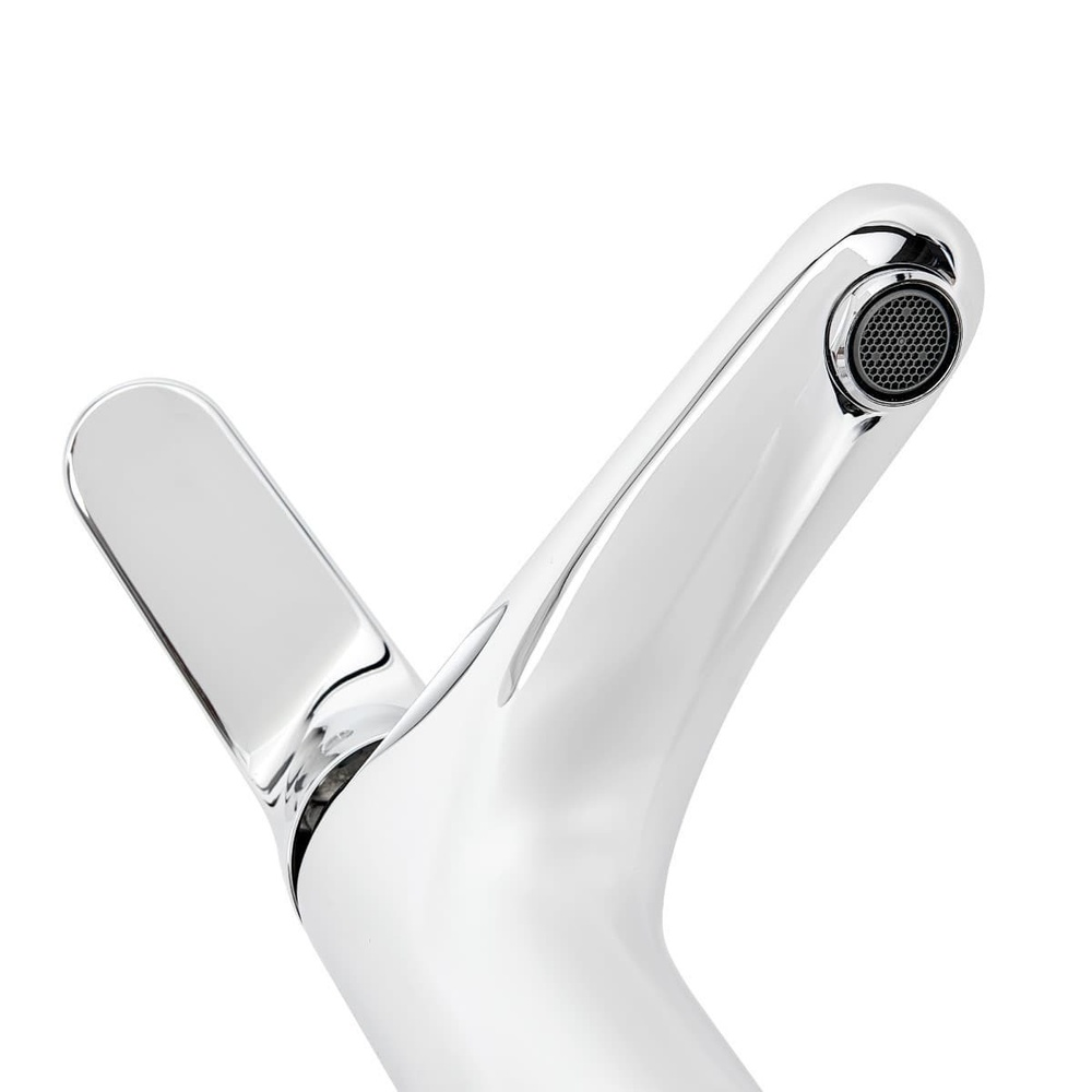 Robinet de lavabo à levier bas sans Déchets avec fonction de démarrage à froid. Le débit est de 5 litres/minute. En finition chromée brillante.