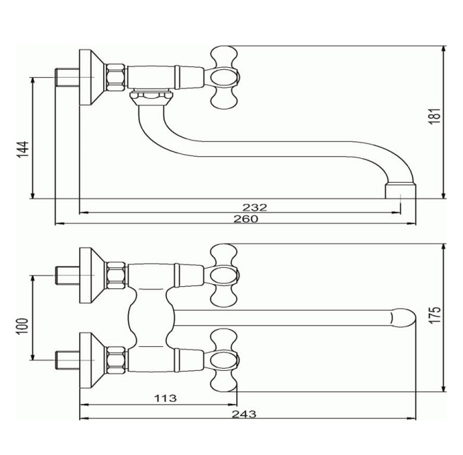 Robinet mural avec bras tournant. Au design rétro. En finition chromée. Distance entre les robinets : 100 Mp.