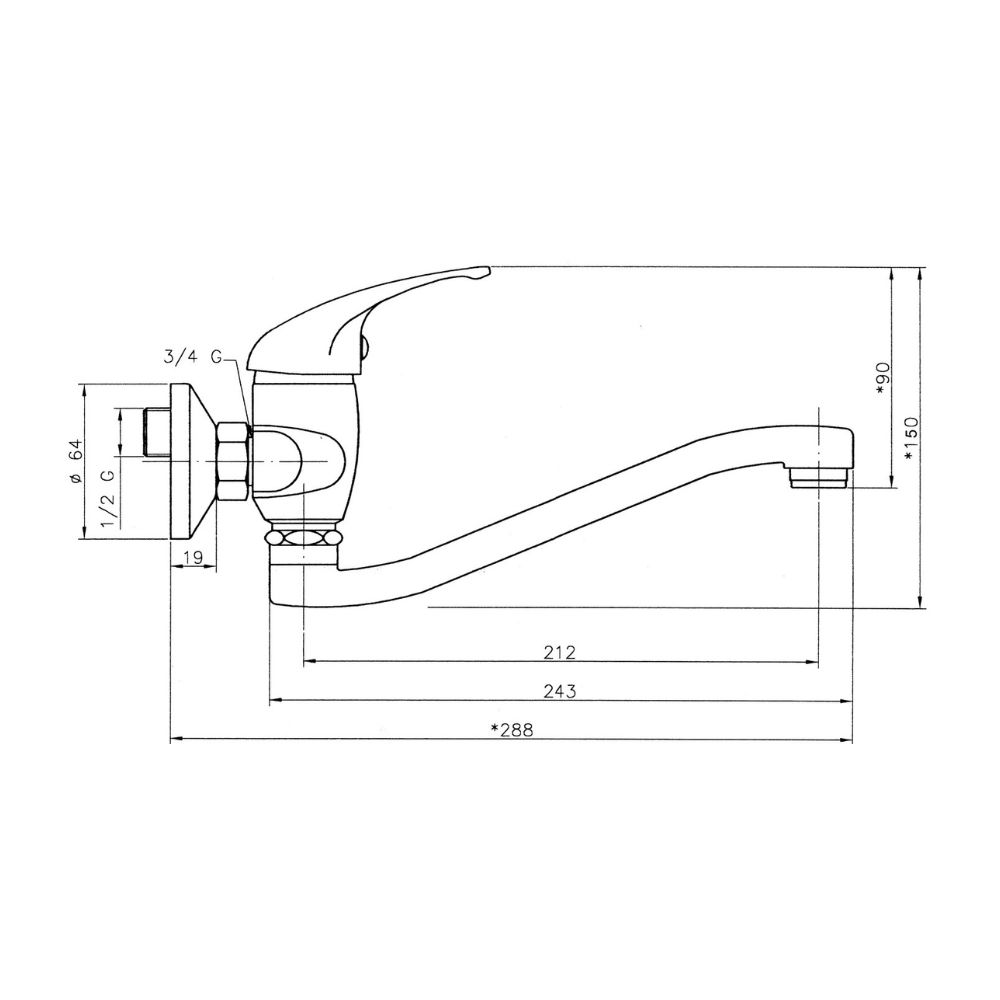 Robinet d'évier mural à levier avec bras tournant. Design rond. En finition chromée. Distance entre les robinets : 150 Mp.