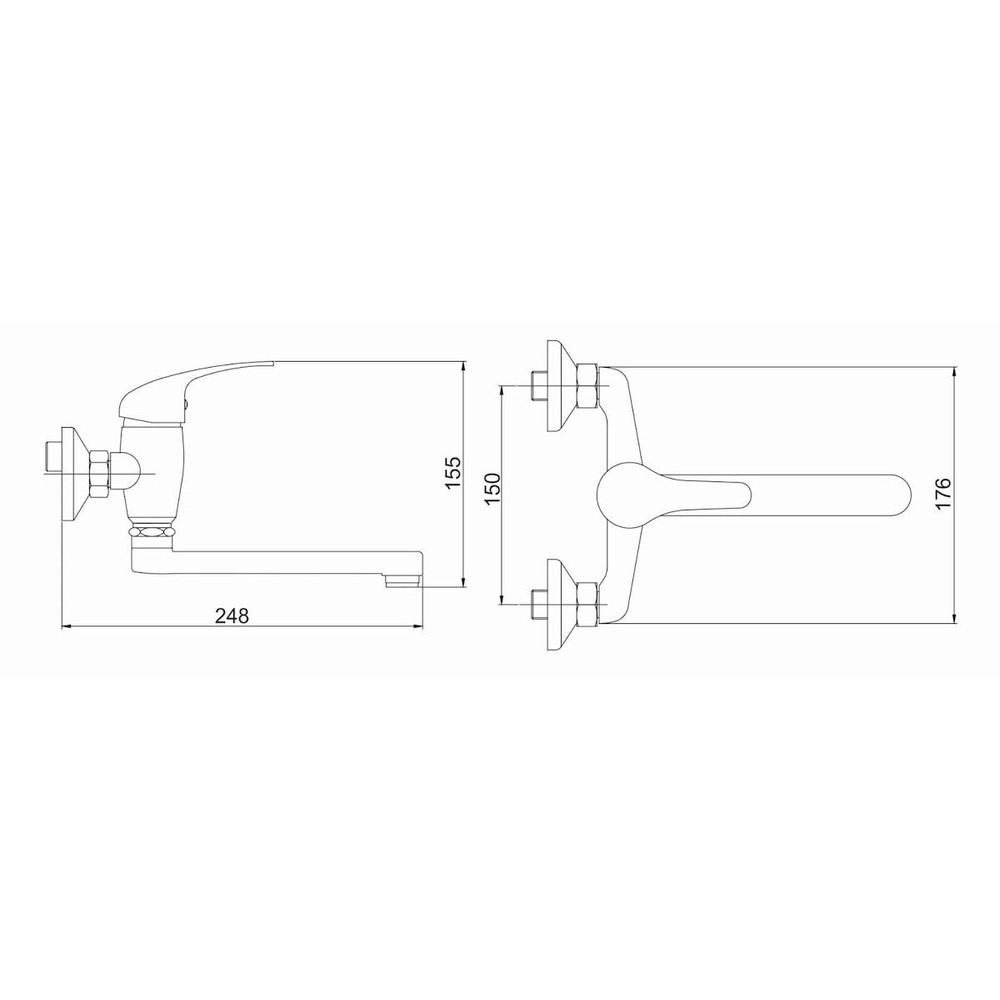 Robinet d'évier mural à levier avec bras tournant. Design rond. En finition chromée. Distance entre les robinets : 150 Mp.
