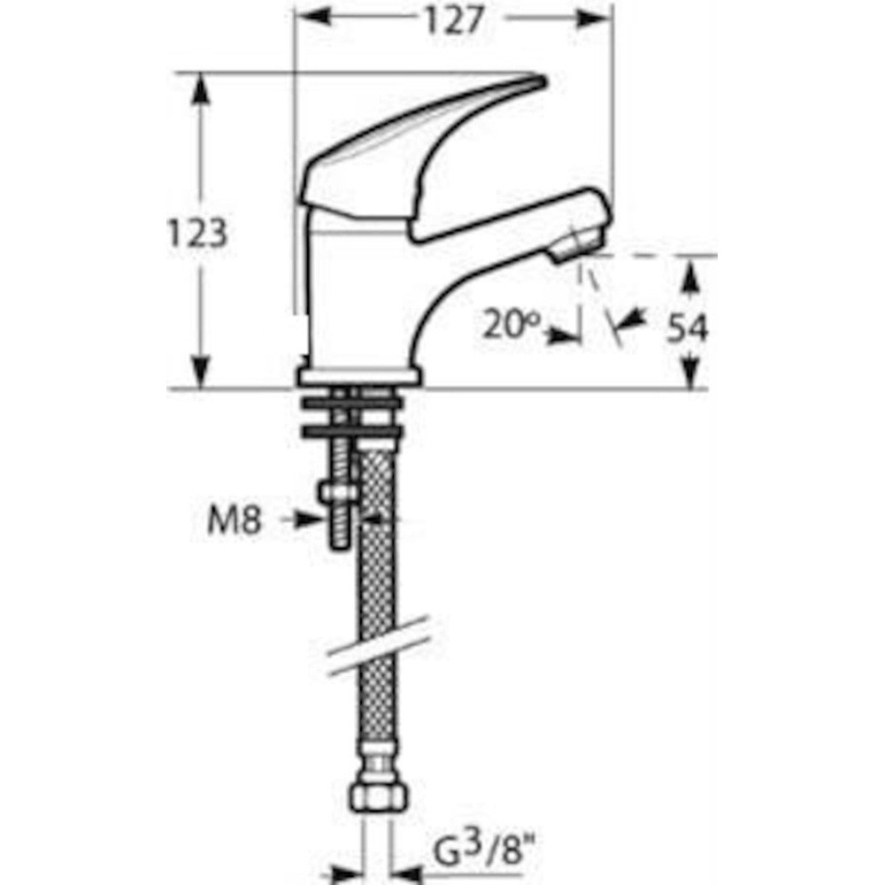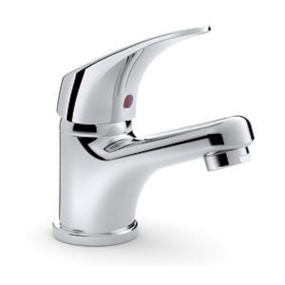 Robinet de lavabo à levier sans Déchets. En VOVO. La hauteur du mitigeur est de 12,3 cm. La hauteur du bras est de 5,4 cm.