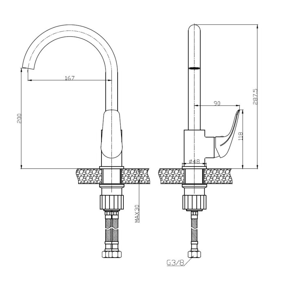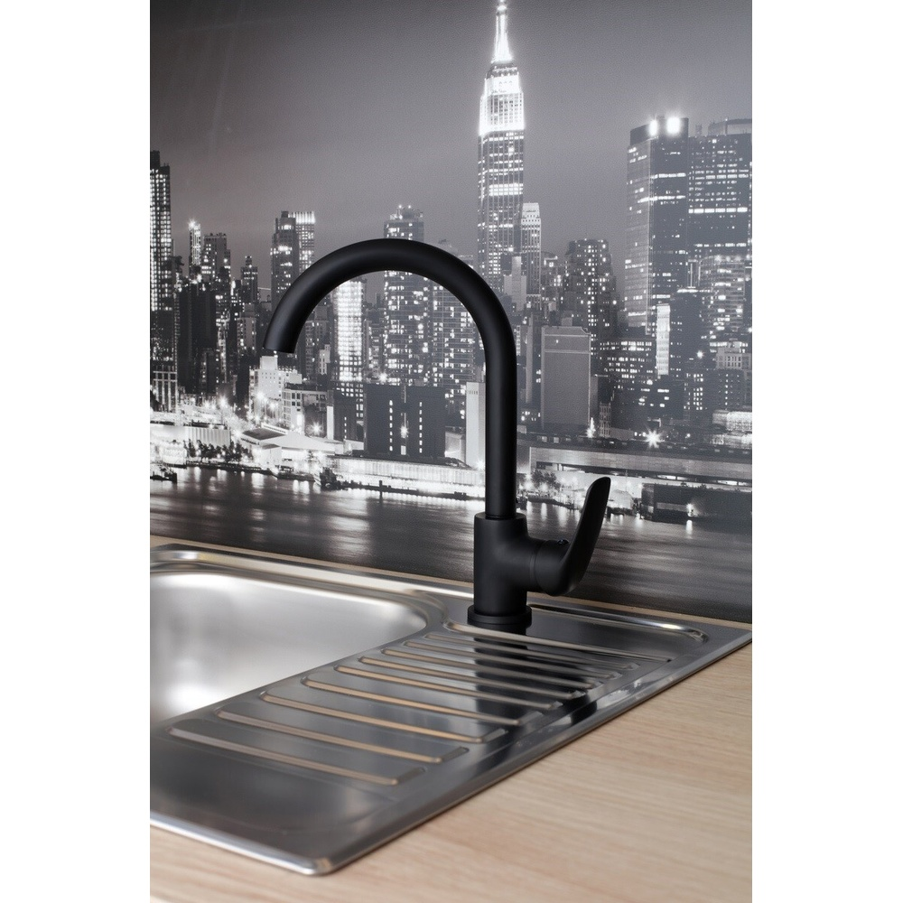 Robinet de cuisine à levier avec bec tournant. En Couleur Noir. La hauteur du mitigeur est de 28,75 cm. Le bras est à une hauteur de 20 cm. SAT en finition mate.