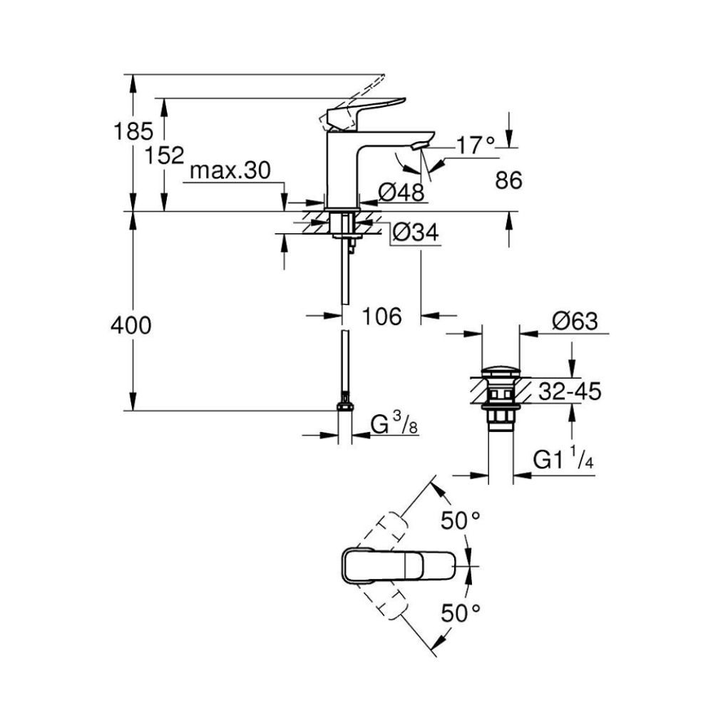 Caractéristiques du mitigeur monocommande de lavabo à levier avec vidage Clic-Clac, Grohe Dice, noir mat (1018572430) :