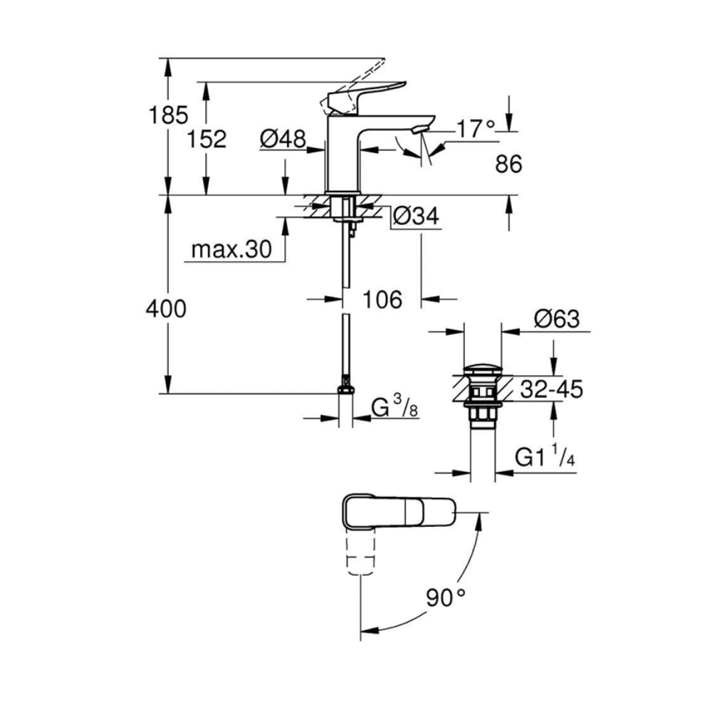 Caractéristiques du mitigeur monocommande de lavabo à levier avec vidage Clic-Clac, Grohe Dice, chrome brillant (1018610000) :