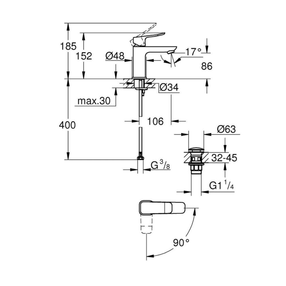 Caractéristiques du mitigeur monocommande de lavabo à levier avec vidage Clic-Clac, Grohe Dice, noir mat (1018612430) :