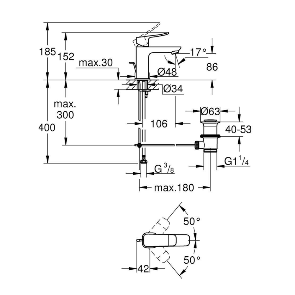 Caractéristiques du mitigeur monocommande de lavabo à levier avec vidage, Grohe Dice, noir mat (1018562430) :