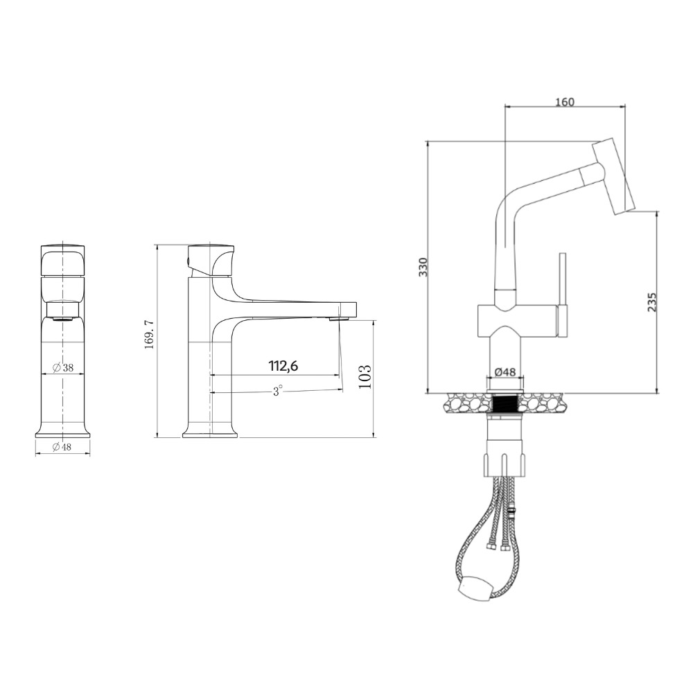 Caractéristiques du set mitigeur lavabo à levier Swiss Aqua Technologies Dark, or mat + mitigeur cuisine acier inoxydable avec douchette extractible, Ceramia Timeless, or brossé (SATB185BG) :