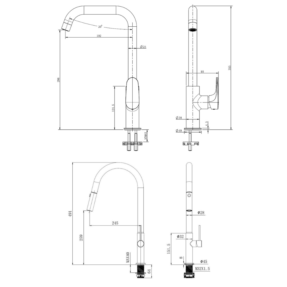 - Hauteur du mitigeur : 491 mm