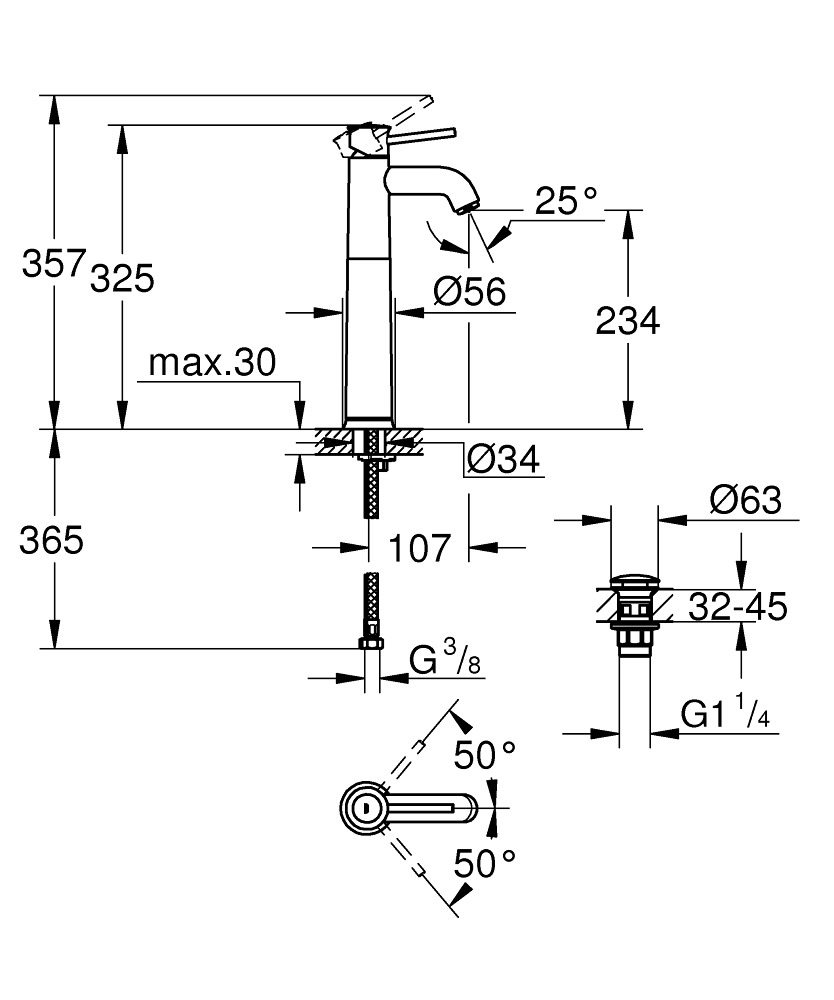 Caractéristiques du Lot de 2 mitigeurs monocommande lavabo taille XL, Grohe Start Classic (23784000-DUO) :
