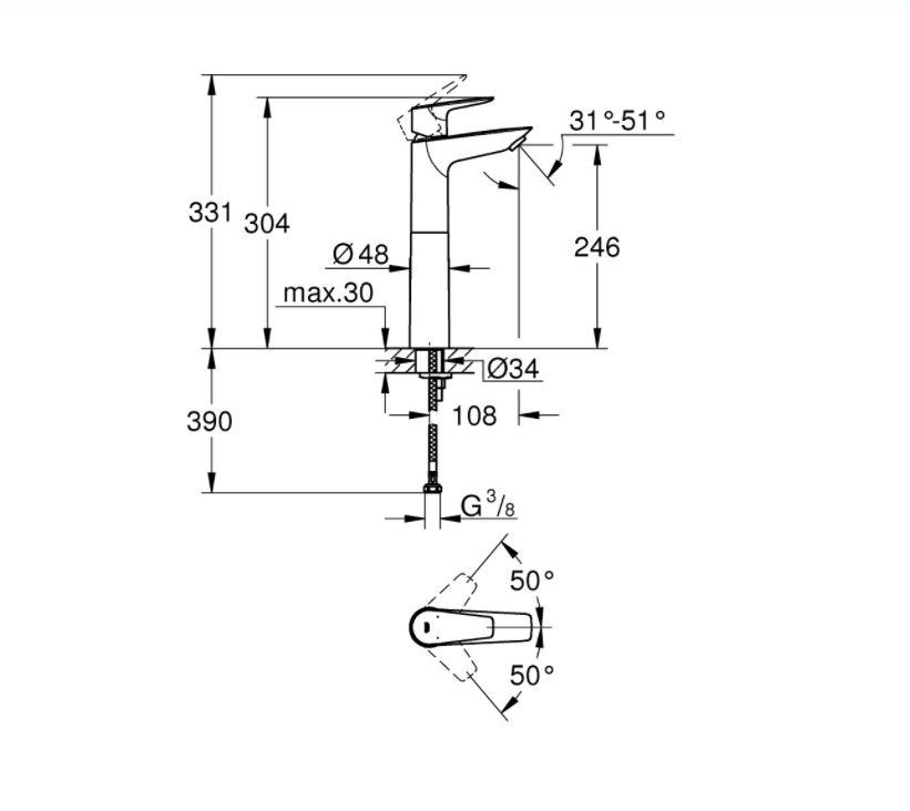 Caractéristiques du Mitigeur monocommande lavabo taille XL, Chrome, Grohe BauEdge (23761001) :