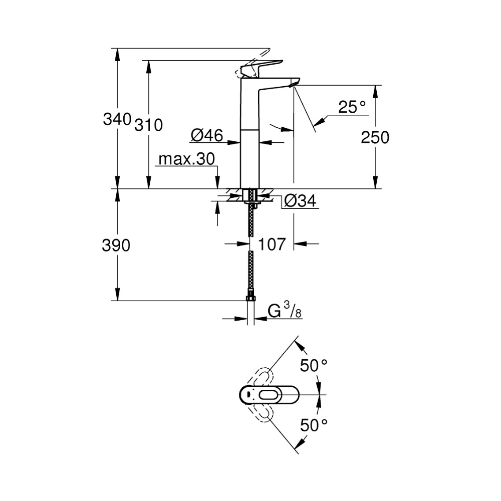 Caractéristiques du mitigeur monocommande pour vasque à poser, taille XL, Grohe Bauloop, chrome (23764000) :