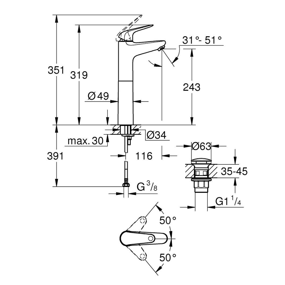 Caractéristiques du mitigeur monocommande pour vasque à poser, taille XL, Grohe Swift, chrome (24331001) :