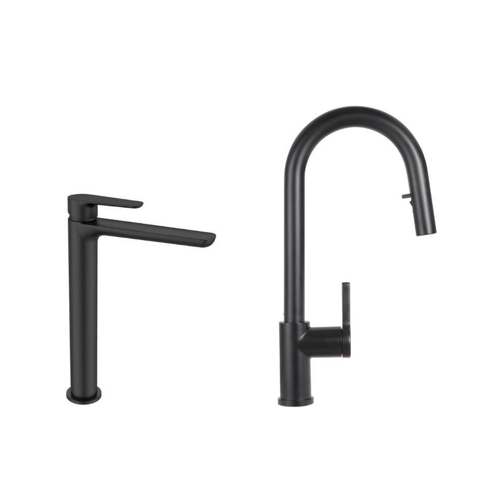 Mood set mitigeur lavabo XL + mitigeur de cuisine Ceramia Timeless acier inoxydable, douchette extractible, noir mat (SATBM285C)