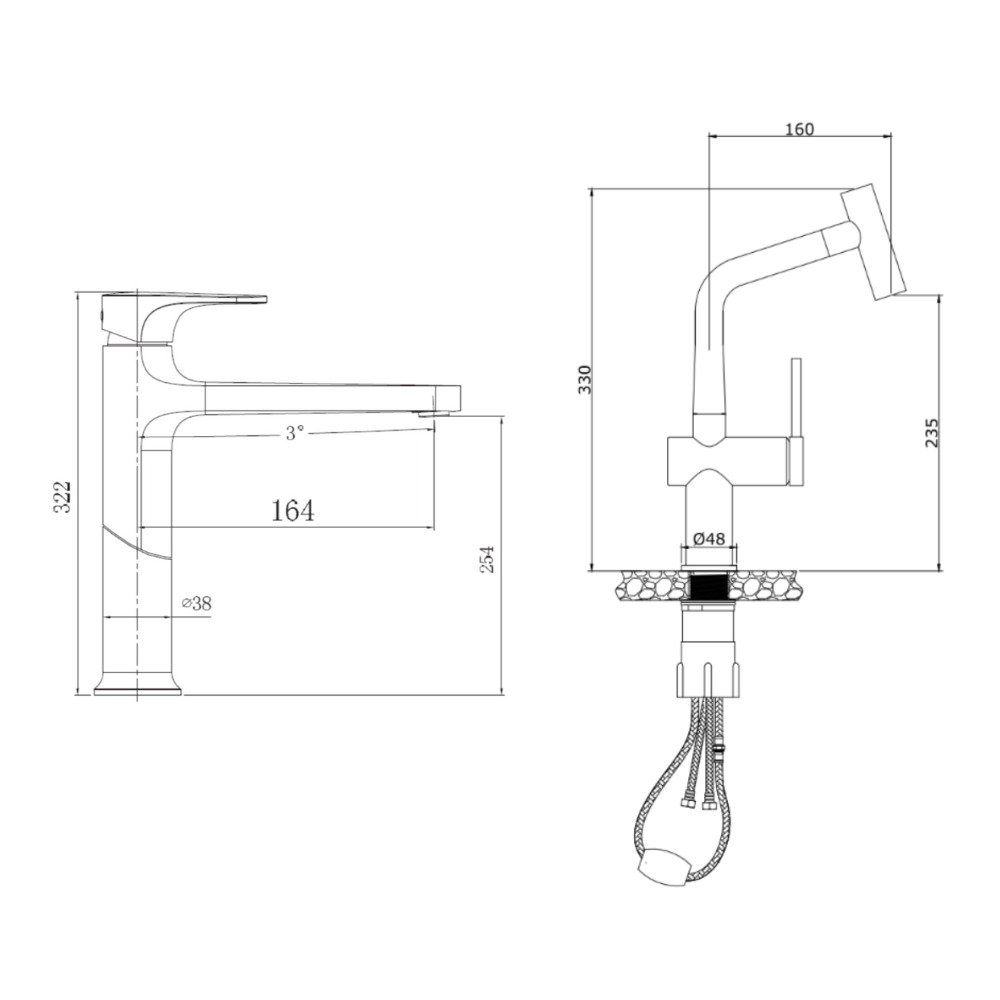 Caractéristiques du set mitigeur lavabo XL à levier Swiss Aqua Technologies Dark + mitigeur cuisine en acier inoxydable, douchette extractible 2 jets, Ceramia Timeless, or brossé (SATTMLDA1285BG) :