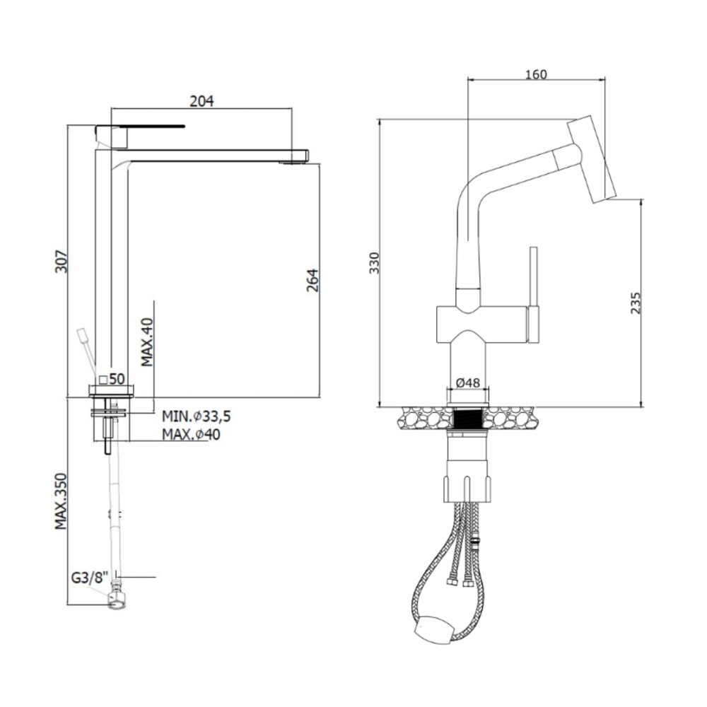 Caractéristiques du set mitigeur lavabo XL à levier Swiss Aqua Technologies B-Way + mitigeur de cuisine Ceramia Timeless en acier inoxydable, douchette extractible, noir mat (SATBW185BM) :