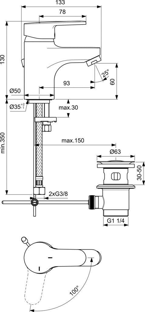 - Hauteur sous aérateur 60 mm. Projection 93 mm