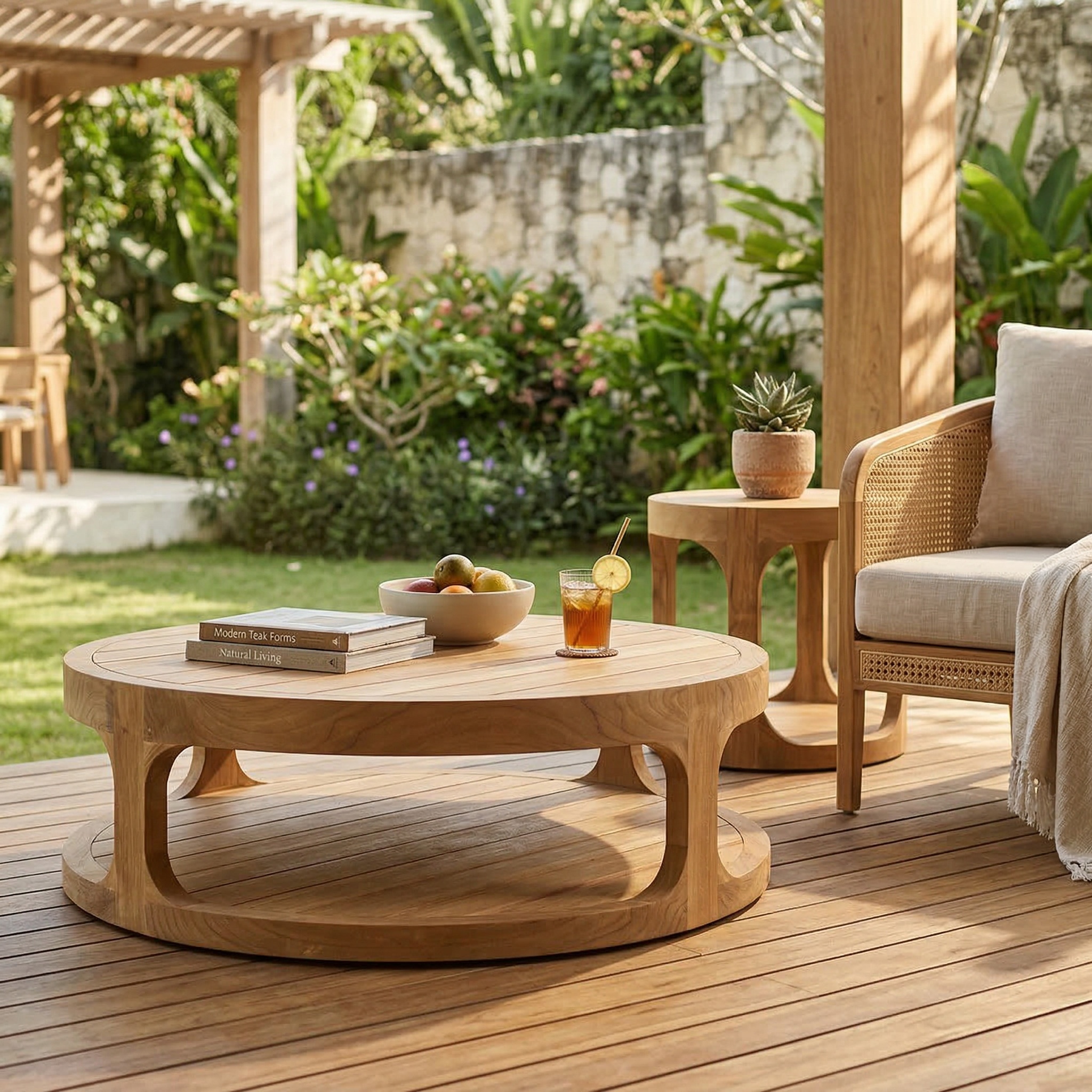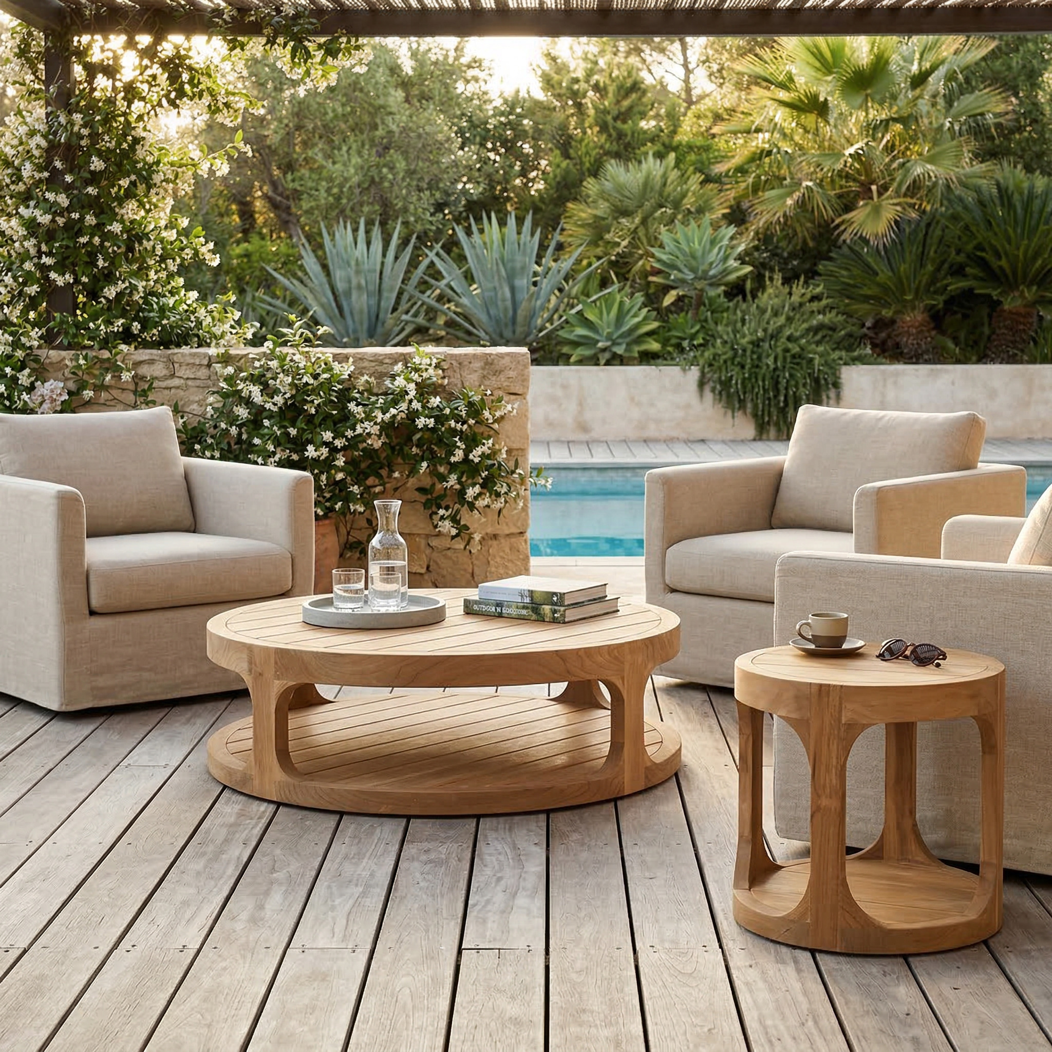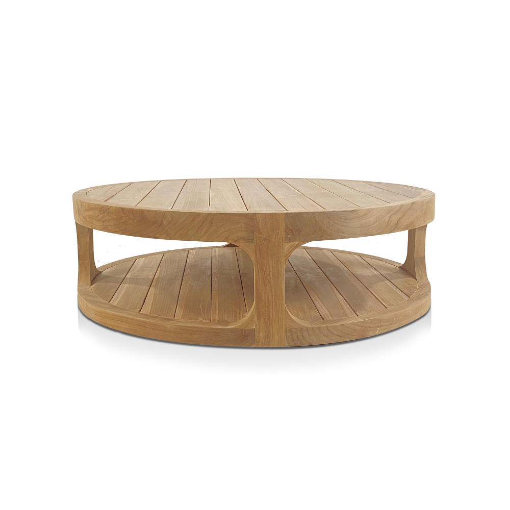 Table basse ronde en teck massif 120x120x35,5 cm deux plateaux – style chic terrasse piscine (NATOFTB120120R)
