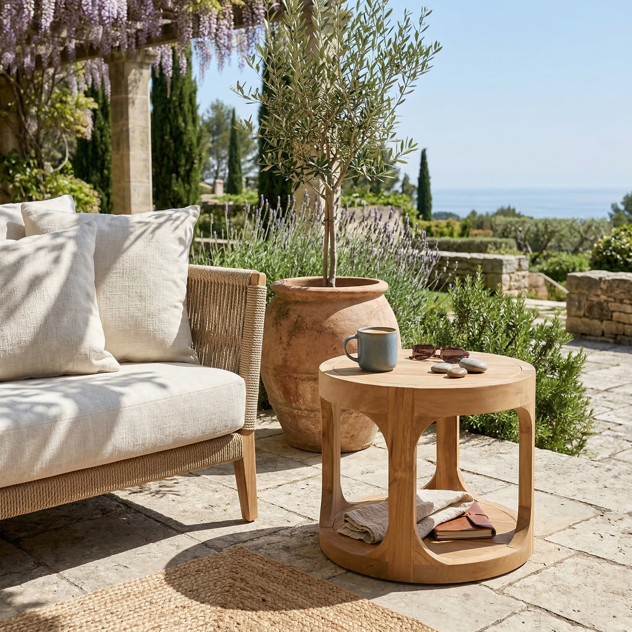 Son teck massif au charme authentique et sa conception à deux plateaux donnent immédiatement un aspect chic et chaleureux à votre extérieur, comme une maison de vacances où l’on aime passer du temps.