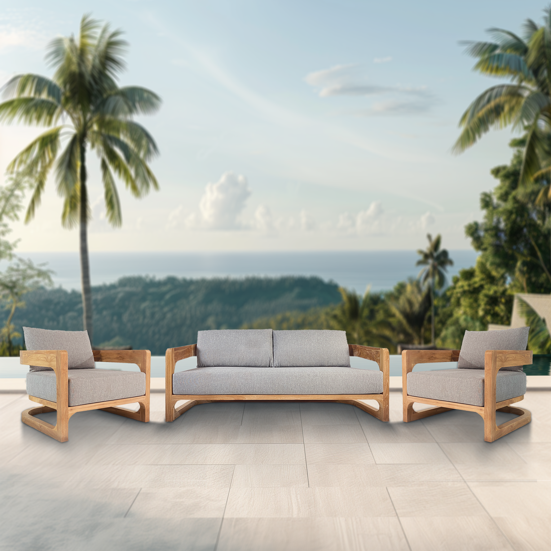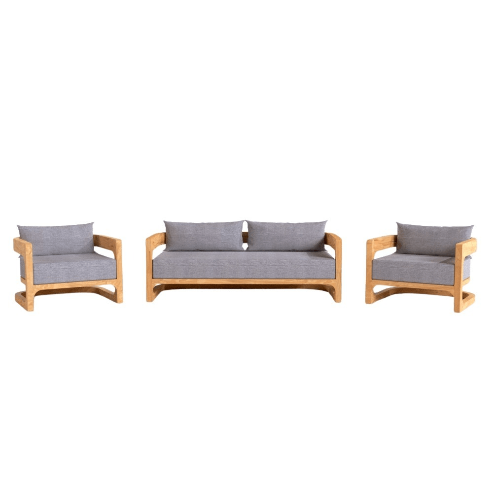 Naturel Set canapé 180x86x60 cm + 2 fauteuils 87x86x60 cm de jardin en teck massif, avec coussins gris perlé (NATOFSF180-SET)