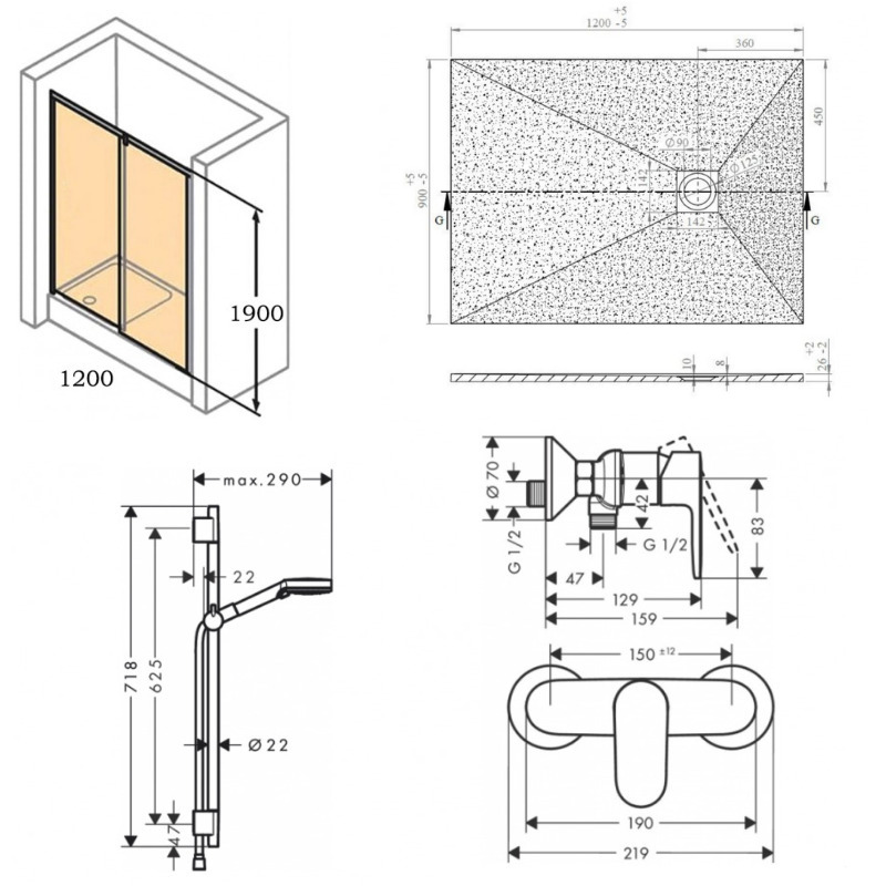 Caractéristiques du Pack douche Porte coulissante 120cm + Set de douche avec mitigeur Hansgrohe + Receveur Satalek 120x80cm, Noir (HuppeHansgrohe1-12080BL-5) :