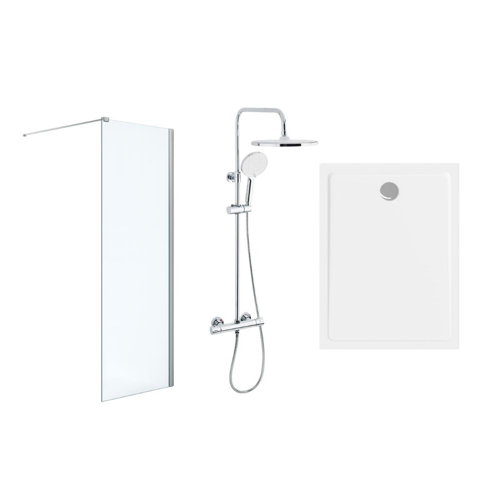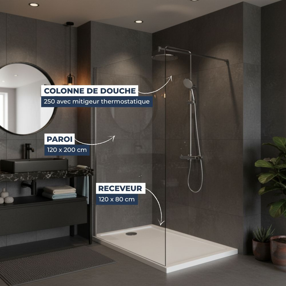 Paroi Walk-in SATBWI120PR en verre Crystal Glass® 8 mm avec traitement anticalcaire, profilés muraux et inférieurs chromés, bras de fixation inclus. Colonne de douche SATSSTKE avec mitigeur thermostatique VERNET, douche de tête 250 mm et douchette 3 jets. Receveur 120x80 cm en marbre coulé blanc, à poser ou encastrer, livré avec siphon.