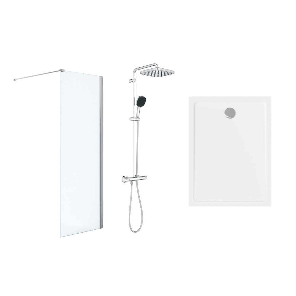 Pack Douche Complet – Paroi Walk-In 120x200 Chrome + Colonne Grohe Vitalio 2 Jets + Receveur Marbre Coulé Blanc 120x80