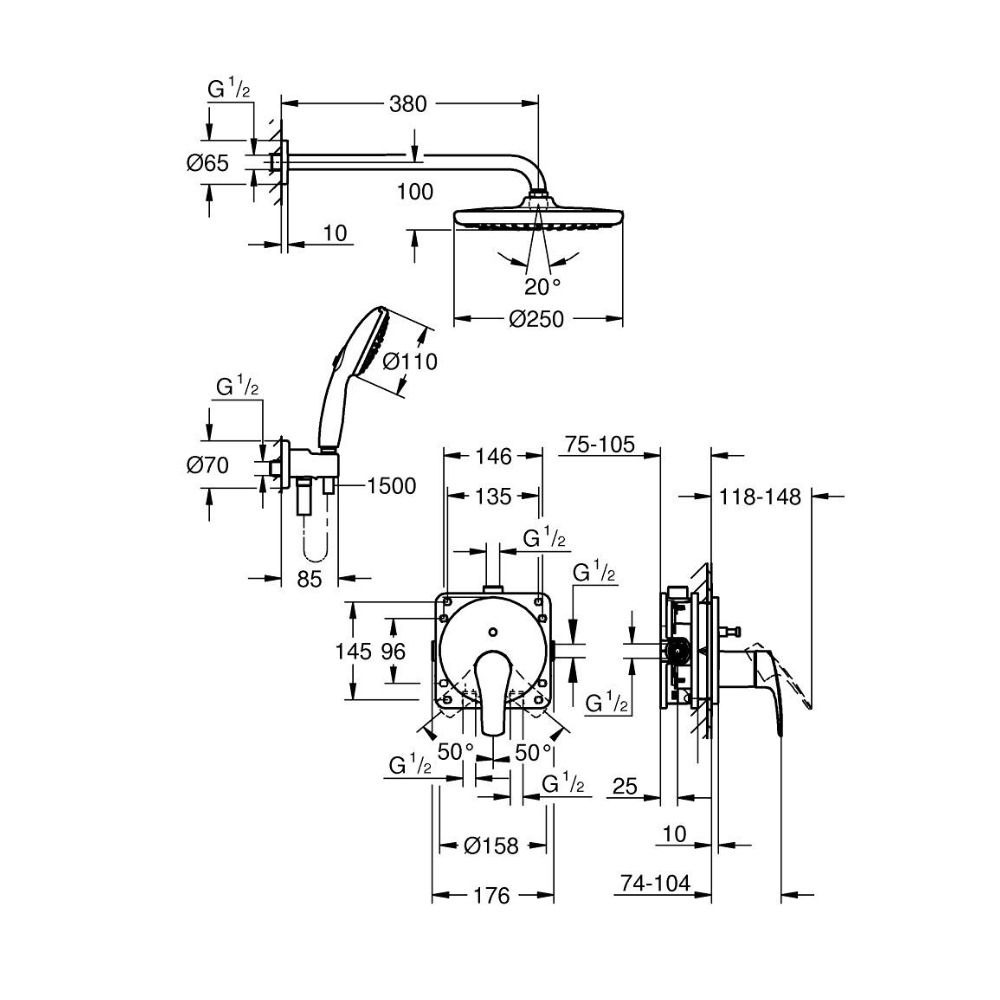 - Grohe Eurosmart set de douche encastré avec mitigeur monocommande + douche de tête + douchette 2 jets, chrome (G25288000)