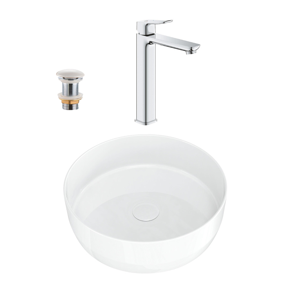 Caractéristiques du mitigeur monocommande à levier pour vasque à poser, taille XL, sans vidage, Grohe Quickfix Dice, chrome brillant + vasque à poser 39x39x12 cm, avec bonde Clic-Clac, sans trop-plein, Swiss Aqua Technologies Infinitio, blanc mat (BA3-G1018920000-03) :